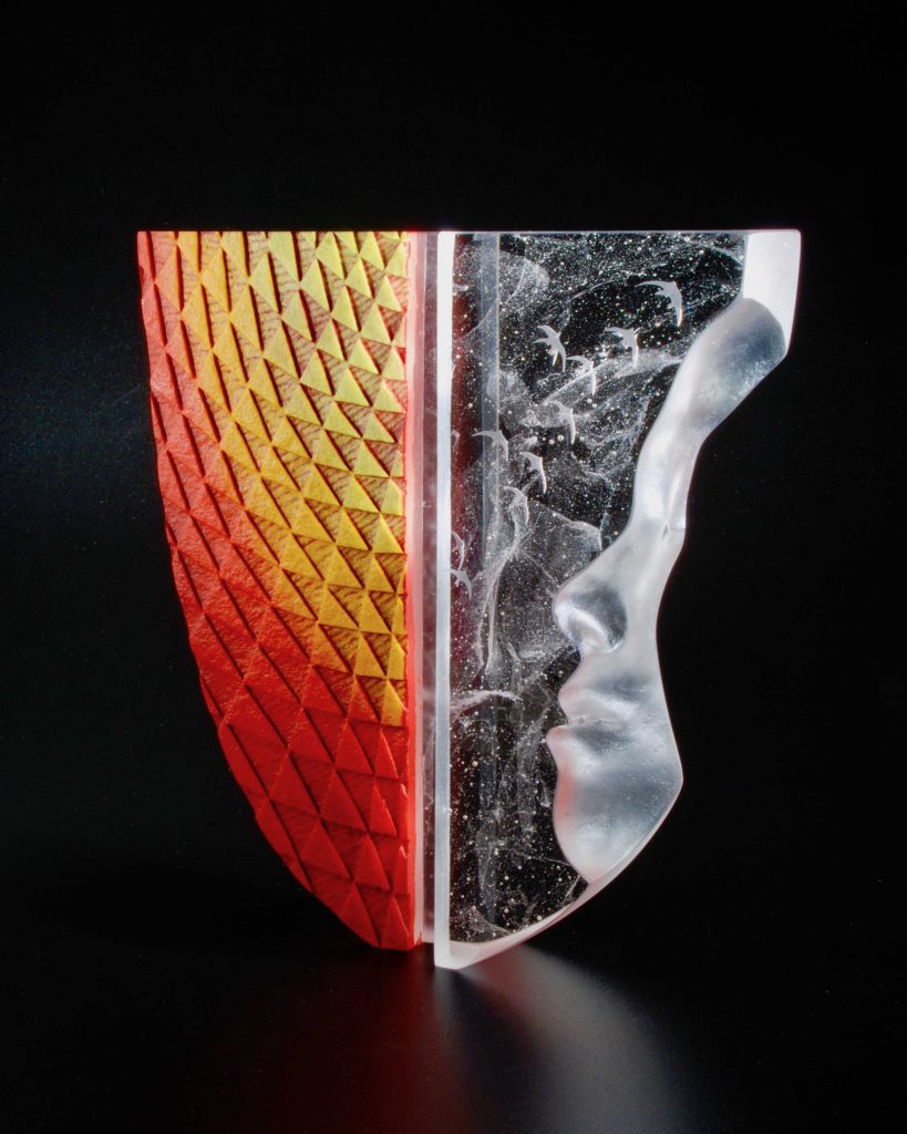 Most of my work is kiln casting. I have cast my face and put a segment of this into each piece which I feel is like a symbol or item, reflecting or indicating that this is my own journey. I also combine this with sandblasting images to imply a different layer of expression into these solid glass sculptures. Another technique I use is pâte de verre. In the last 3years or so, I have started to work with the idea of expressing the surface of an object in different ways. I am trying to adapt this technique, as well as working with the fragility of this technique.