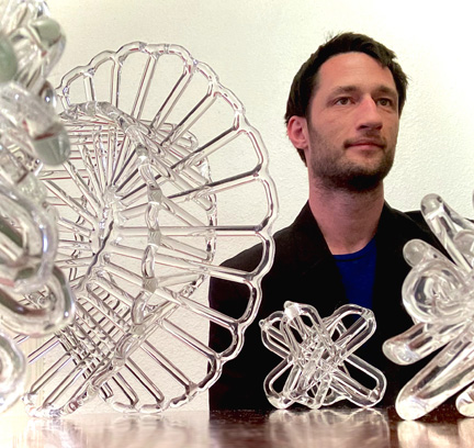 Anduriel Widmark, born in 1987, is an American Artist from Denver, Colorado. In 2010, he received a Bachelors of Fine Arts degree, with a concentration in painting, from Metropolitan State University of Denver. Throughout childhood, Anduriel was attracted to the elegance and beauty in numbers and over time has found ways to explore his interest in mathematics using art. Glass Sculptures and oil paintings materialize abstract geometric patterns with bright dynamic shapes and interweaving lines. He frequently exhibits internationals, including at the Bridges Math Art conferences, Joint Mathematics Meetings and the mathematical Association of America. Anduriel’s work plays with structures and their properties to develop new perspectives, using math to explore and celebrate the patterns that create our world.